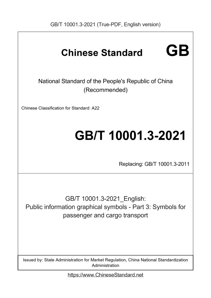 Delivery: <= 5 days. True-PDF full-copy in English will be manually translated and delivered via email. GB/T 10001.3-2021: Public information graphical symbols - Part 3: Symbols for passenger and cargo transport Status: Valid GB/T 10001.3: Historical versions