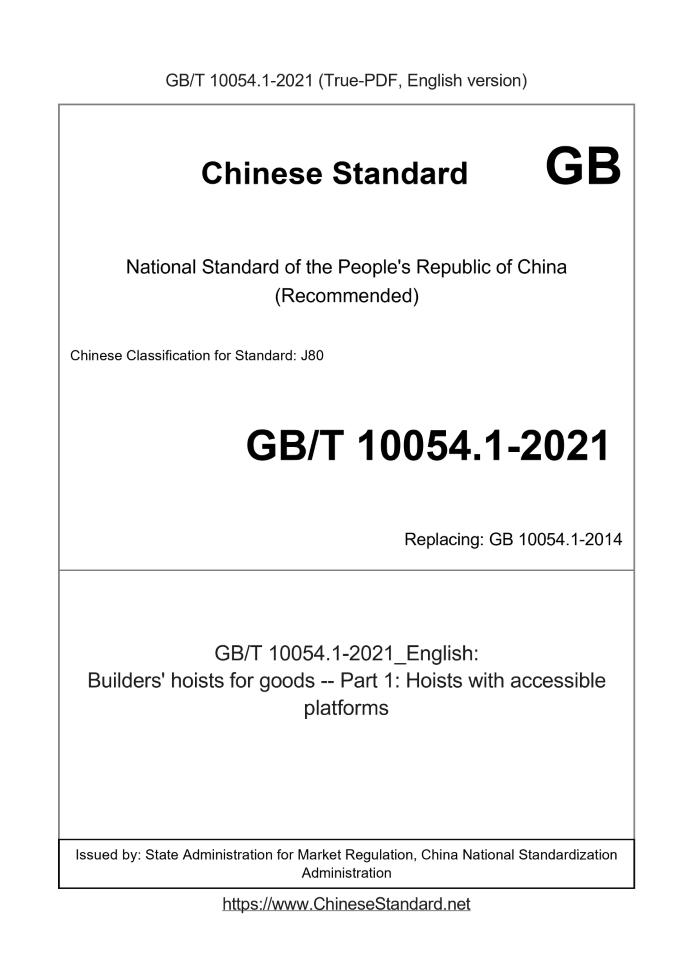 Delivery: <= 7 days. True-PDF full-copy in English will be manually translated and delivered via email. GB/T 10054.1-2021: Builders' hoists for goods -- Part 1: Hoists with accessible platforms Status: Valid GB/T 10054.1: Historical versions