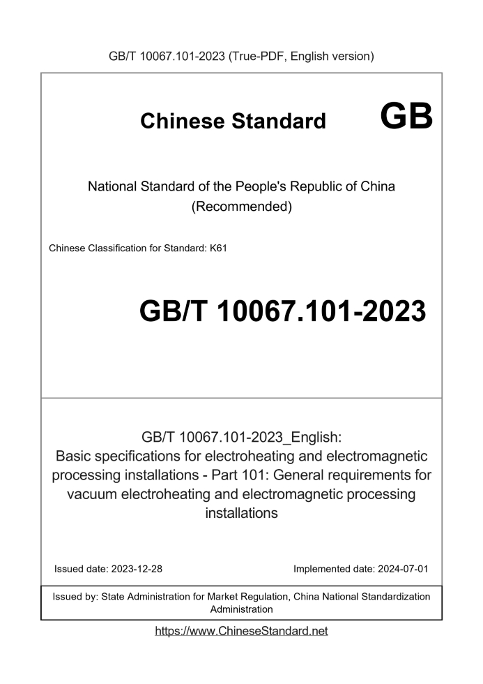 Delivery: <= 6 days. True-PDF full-copy in English will be manually translated and delivered via email. GB/T 10067.101-2023: Basic specifications for electroheating and electromagnetic processing installations - Part 101: General requirements for vacuum electroheating and electromagnetic processing installations Status: Valid
