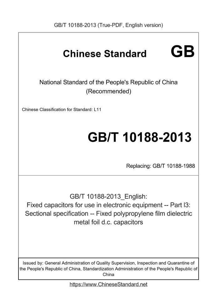 Delivery: <= 3 days. True-PDF full-copy in English will be manually translated and delivered via email. GB/T 10188-2013: Fixed capacitors for use in electronic equipment -- Part l3: Sectional specification -- Fixed polypropylene film dielectric metal foil d.c. capacitors Status: Valid GB/T 10188: Historical versions