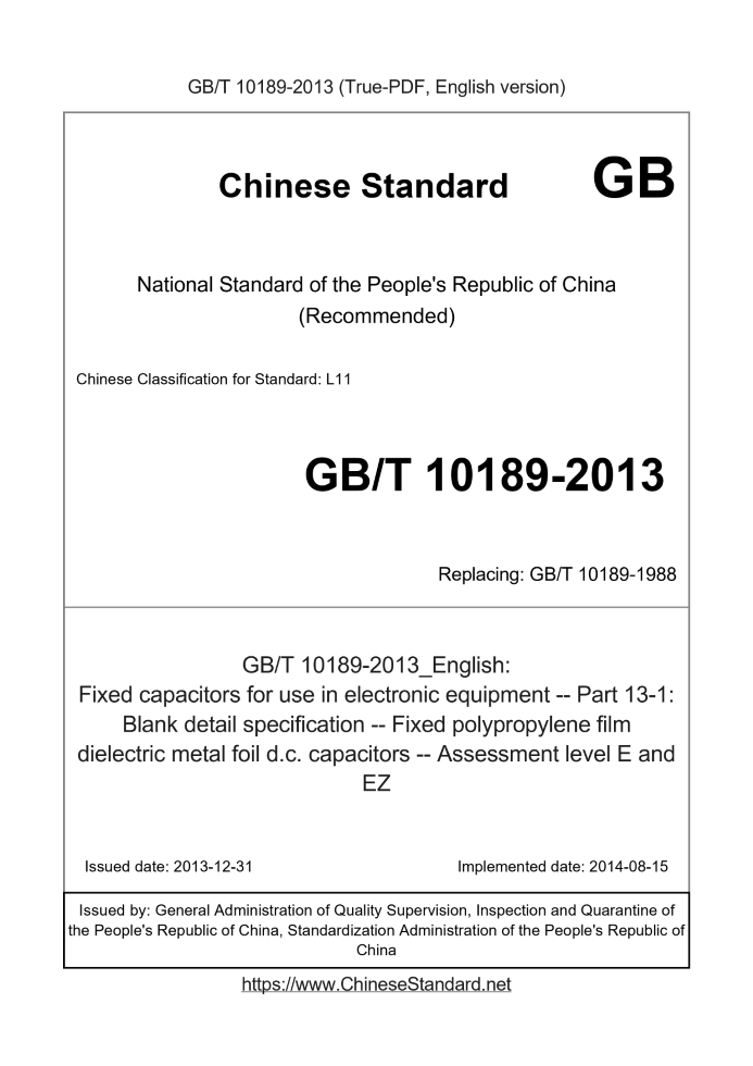 Delivery: <= 3 days. True-PDF full-copy in English will be manually translated and delivered via email. GB/T 10189-2013: Fixed capacitors for use in electronic equipment -- Part 13-1: Blank detail specification -- Fixed polypropylene film dielectric metal foil d.c. capacitors -- Assessment level E and EZ Status: Valid GB/T 10189: Historical versions