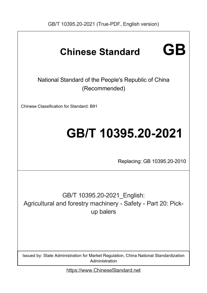 Delivery: <= 4 days. True-PDF full-copy in English will be manually translated and delivered via email. GB/T 10395.20-2021: Agricultural and forestry machinery - Safety - Part 20: Pick-up balers Status: Valid GB/T 10395.20: Historical versions