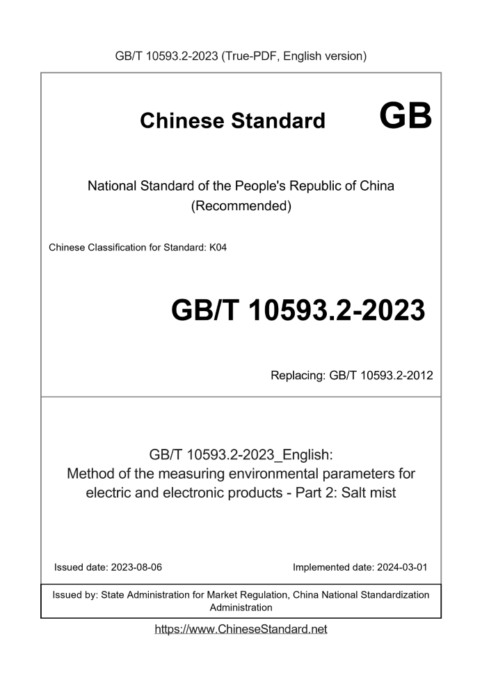 Delivery: <= 4 days. True-PDF full-copy in English will be manually translated and delivered via email. GB/T 10593.2-2023: Method of the measuring environmental parameters for electric and electronic products - Part 2: Salt mist Status: Valid GB/T 10593.2: Historical versions