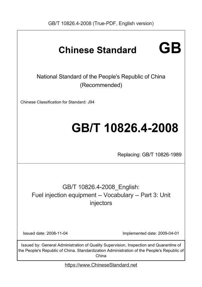 Delivery: <= 3 days. True-PDF full-copy in English will be manually translated and delivered via email. GB/T 10826.4-2008: Fuel injection equipment -- Vocabulary -- Part 3: Unit injectors Status: Valid