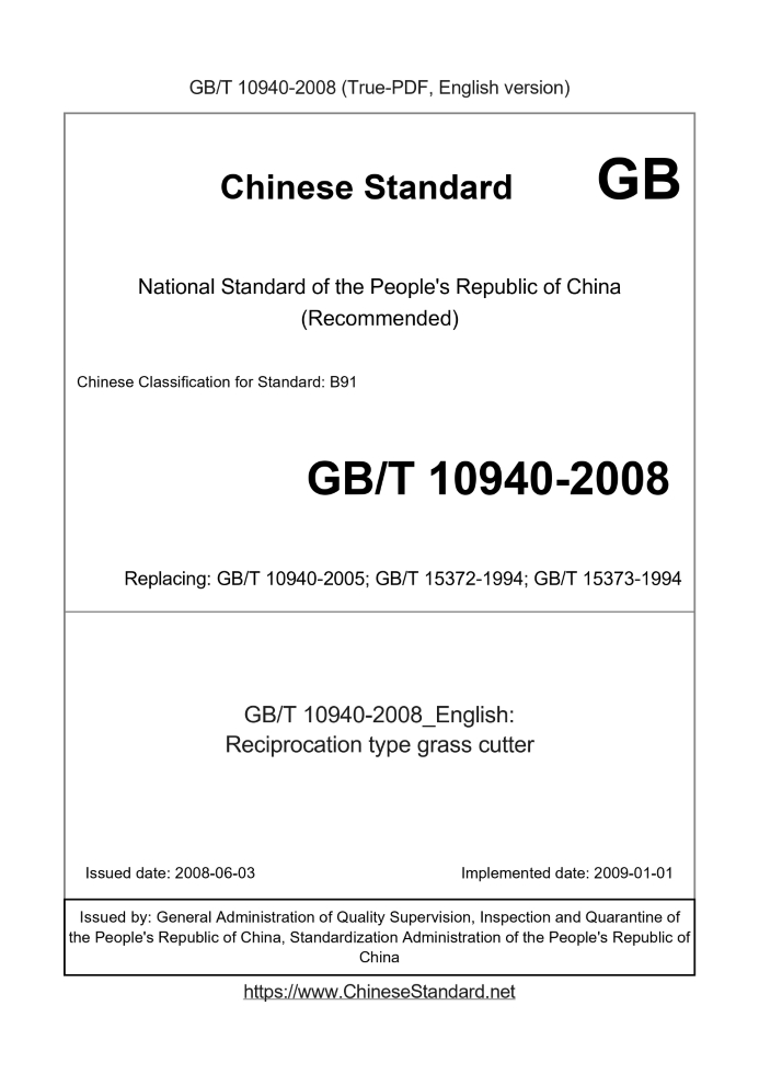 Delivery: <= 3 days. True-PDF full-copy in English will be manually translated and delivered via email. GB/T 10940-2008: Reciprocation type grass cutter Status: Valid GB/T 10940: Historical versions