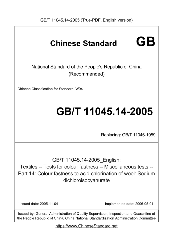 Delivery: <= 3 days. True-PDF full-copy in English will be manually translated and delivered via email. GB/T 11045.14-2005: Textiles -- Tests for colour fastness -- Miscellaneous tests -- Part 14: Colour fastness to acid chlorination of wool: Sodium dichloroisocyanurate Status: Valid