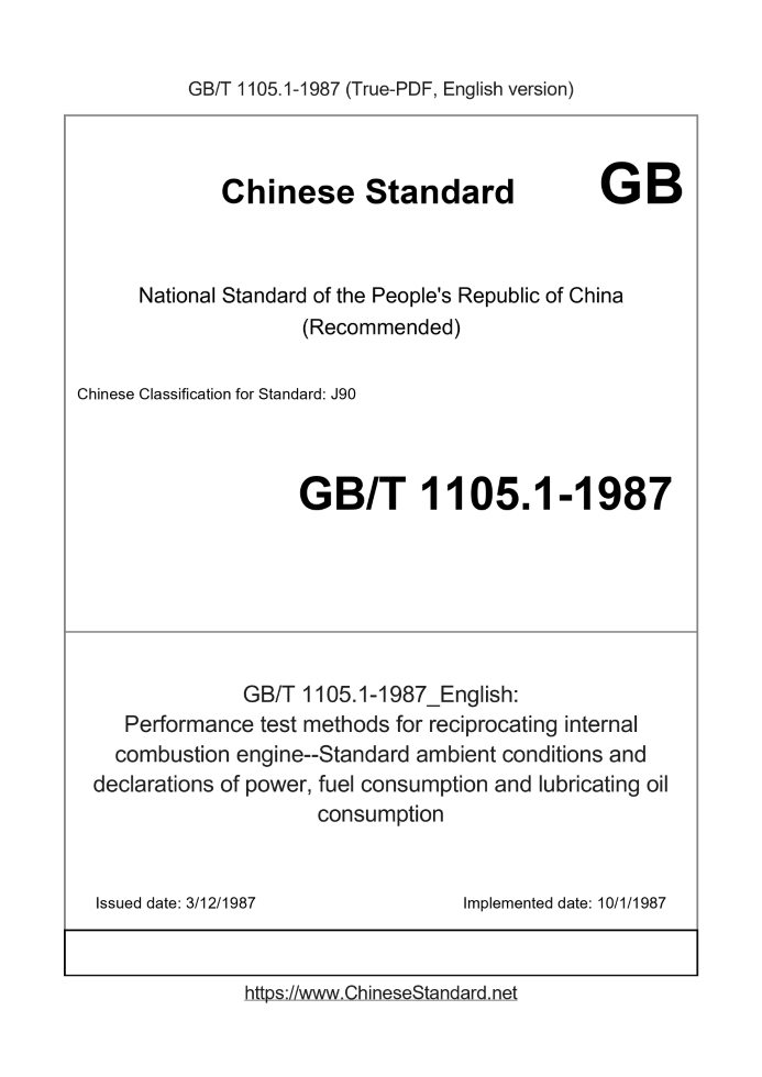 Delivery: <= 5 days. True-PDF full-copy in English will be manually translated and delivered via email. GB/T 1105.1-1987: Performance test methods for reciprocating internal combustion engine--Standard ambient conditions and declarations of power, fuel consumption and lubricating oil consumption Status: Obsolete