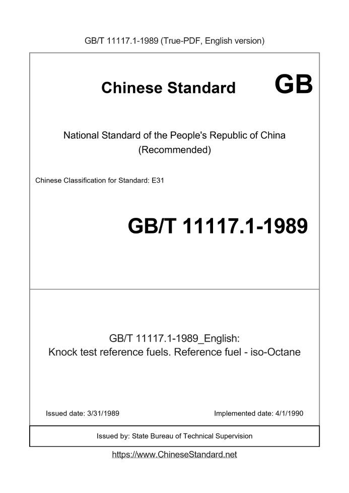 Delivery: <= 2 days. True-PDF full-copy in English will be manually translated and delivered via email. GB/T 11117.1-1989: Knock test reference fuels. Reference fuel - iso-Octane Status: Obsolete