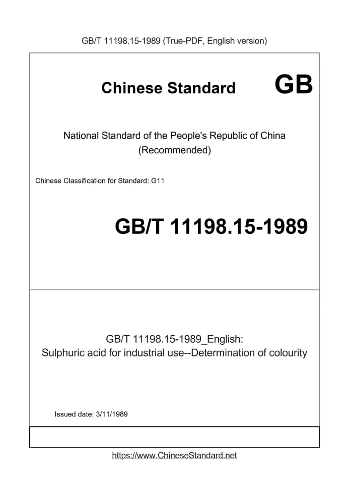 Delivery: <= 2 days. True-PDF full-copy in English will be manually translated and delivered via email. GB/T 11198.15-1989: Sulphuric acid for industrial use--Determination of colourity Status: Obsolete