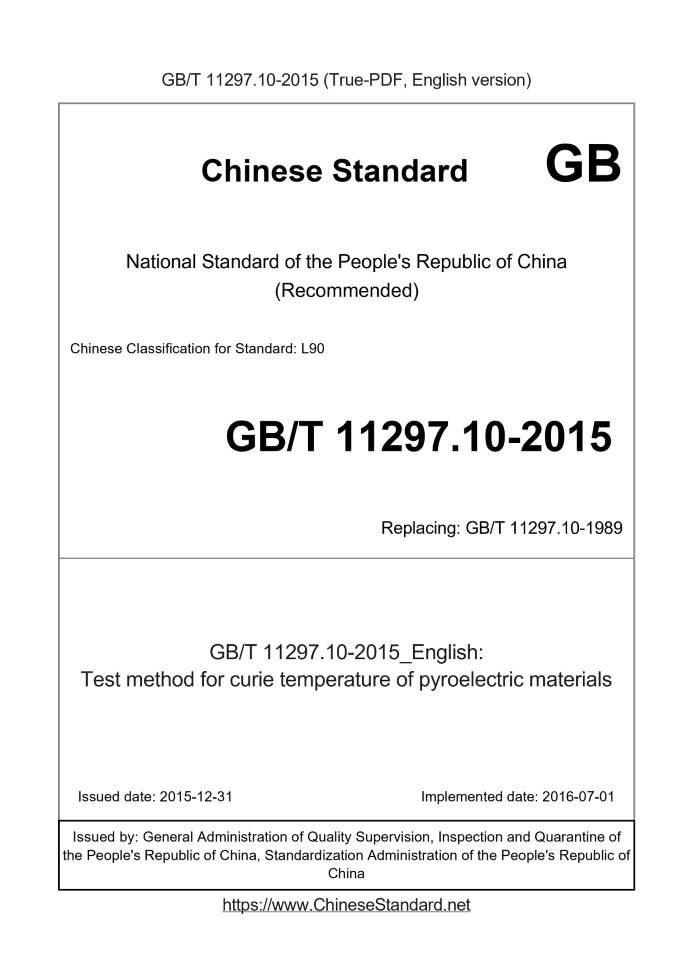 Delivery: <= 3 days. True-PDF full-copy in English will be manually translated and delivered via email. GB/T 11297.10-2015: Test method for curie temperature of pyroelectric materials Status: Valid GB/T 11297.10: Historical versions