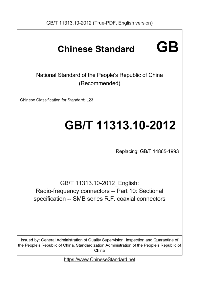 | GB/T 11313.10-2012 English PDFUS$629.00 · In stock Delivery: <= 5 days. True-PDF full-copy in English will be manually translated and delivered via email. GB/T 11313.10-2012: Radio-frequency connectors -- Part 10: Sectional specification -- SMB series R.F. coaxial connectors Status: Valid