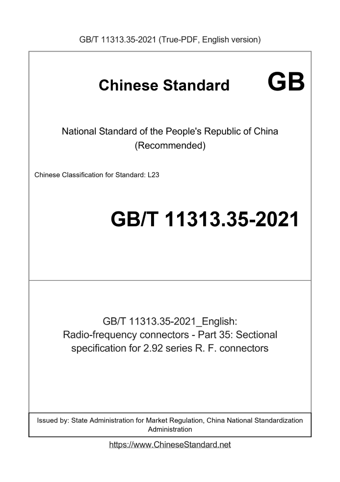 Delivery: <= 3 days. True-PDF full-copy in English will be manually translated and delivered via email. GB/T 11313.35-2021: Radio-frequency connectors - Part 35: Sectional specification for 2.92 series R. F. connectors Status: Valid