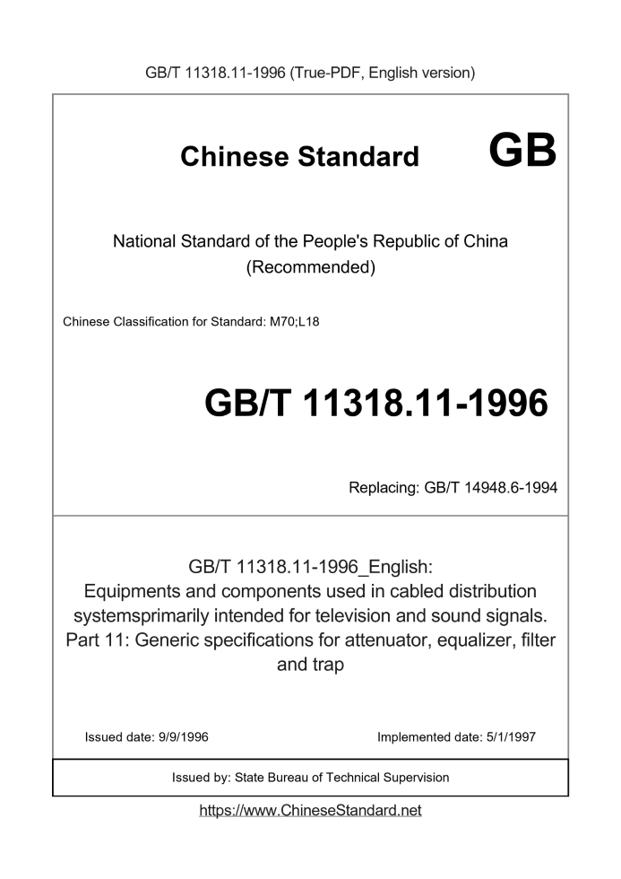 | GB/T 11318.11-1996 English PDFUS$279.00 ยท In stock Delivery: <= 3 days. True-PDF full-copy in English will be manually translated and delivered via email. GB/T 11318.11-1996: Equipments and components used in cabled distribution systemsprimarily intended for television and sound signals. Part 11: Generic specifications for attenuator, equalizer, filter and trap