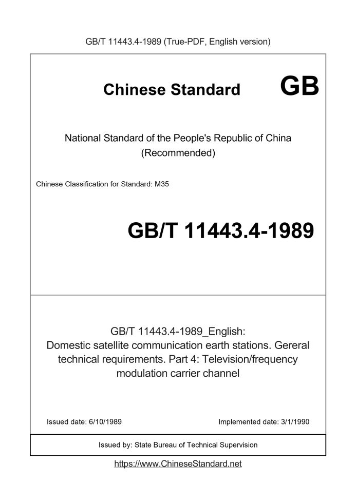 Delivery: <= 3 days. True-PDF full-copy in English will be manually translated and delivered via email. GB/T 11443.4-1989: Domestic satellite communication earth stations. Gereral technical requirements. Part 4: Television/frequency modulation carrier channel Status: Obsolete