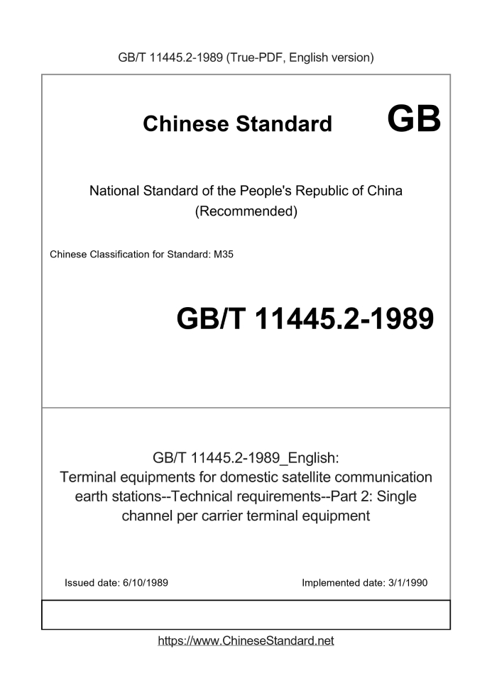 Delivery: <= 4 days. True-PDF full-copy in English will be manually translated and delivered via email. GB/T 11445.2-1989: Terminal equipments for domestic satellite communication earth stations--Technical requirements--Part 2: Single channel per carrier terminal equipment Status: Obsolete