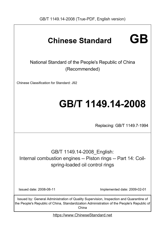 Internal combustion engines Piston rings Part 14. Coil-spring-loaded oil control rings ICS 27.020 J92 National Standards of People's Republic of China GB/T 1149.14-2008/ISO 6626. 1989 Replacing GB/T 1149.7-1994 Piston Ring Part 14. Spiral spring supporting oil ring (ISO 6626. 1989, IDT) Posted 2008-08-11 2009-02-01 implementation Administration of Quality Supervision, Inspection and Quarantine of People's Republic of China Standardization Administration of China released