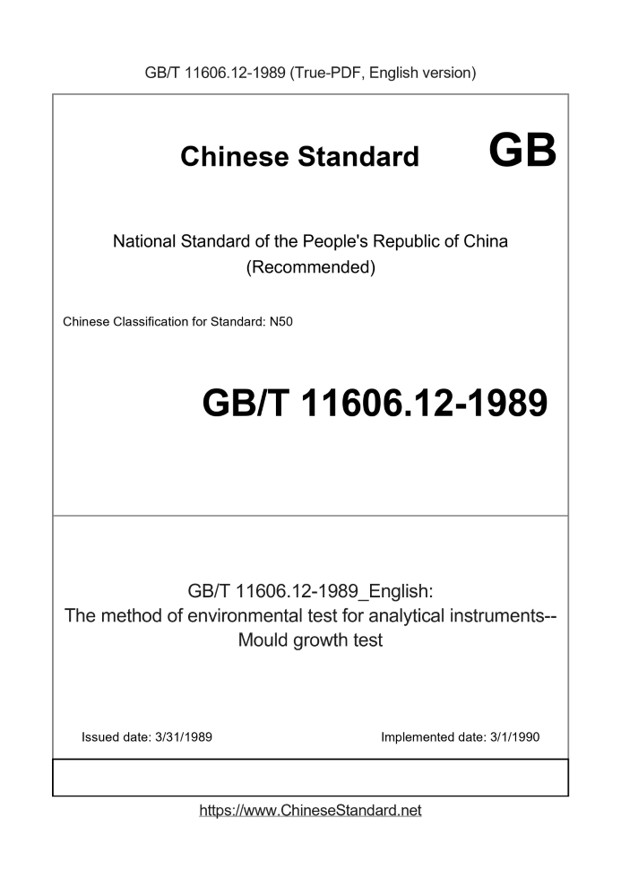 Delivery: <= 2 days. True-PDF full-copy in English will be manually translated and delivered via email. GB/T 11606.12-1989: The method of environmental test for analytical instruments--Mould growth test Status: Obsolete