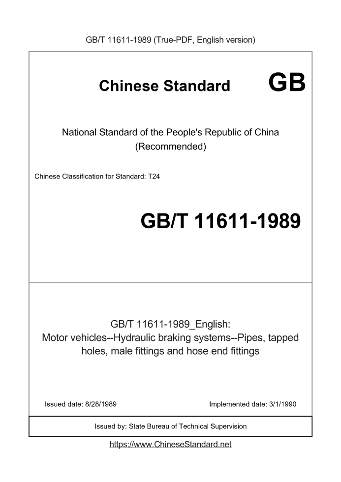 Delivery: <= 3 days. True-PDF full-copy in English will be manually translated and delivered via email. GB/T 11611-1989: Motor vehicles--Hydraulic braking systems--Pipes, tapped holes, male fittings and hose end fittings Status: Obsolete