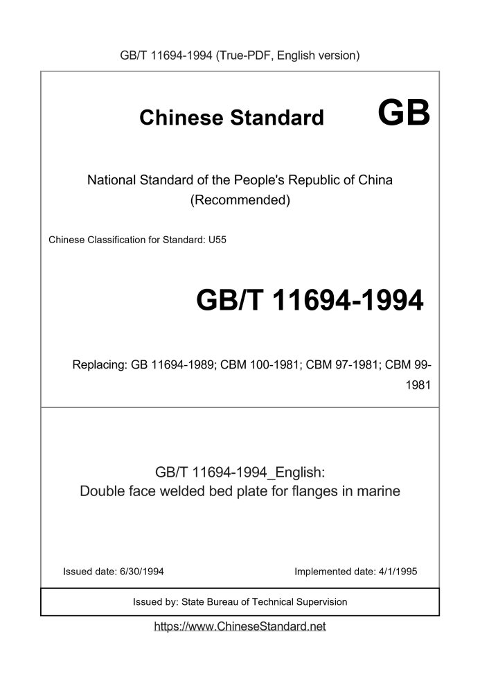 Delivery: <= 3 days. True-PDF full-copy in English will be manually translated and delivered via email. GB/T 11694-1994: Double face welded bed plate for flanges in marine Status: Obsolete GB/T 11694: Historical versions