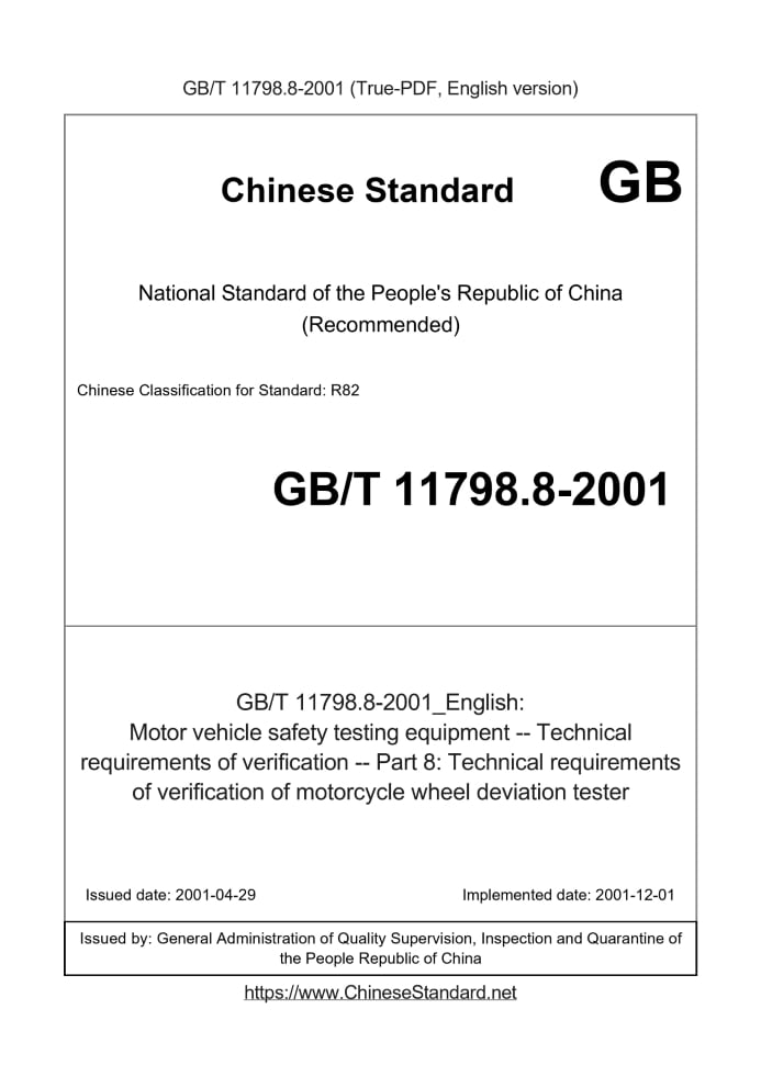 Delivery: <= 2 days. True-PDF full-copy in English will be manually translated and delivered via email. GB/T 11798.8-2001: Motor vehicle safety testing equipment -- Technical requirements of verification -- Part 8: Technical requirements of verification of motorcycle wheel deviation tester Status: Obsolete