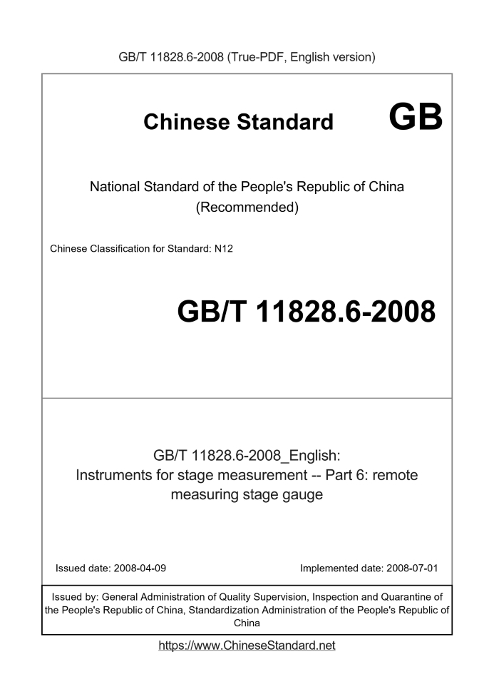 Delivery: <= 3 days. True-PDF full-copy in English will be manually translated and delivered via email. GB/T 11828.6-2008: Instruments for stage measurement -- Part 6: remote measuring stage gauge Status: Valid
