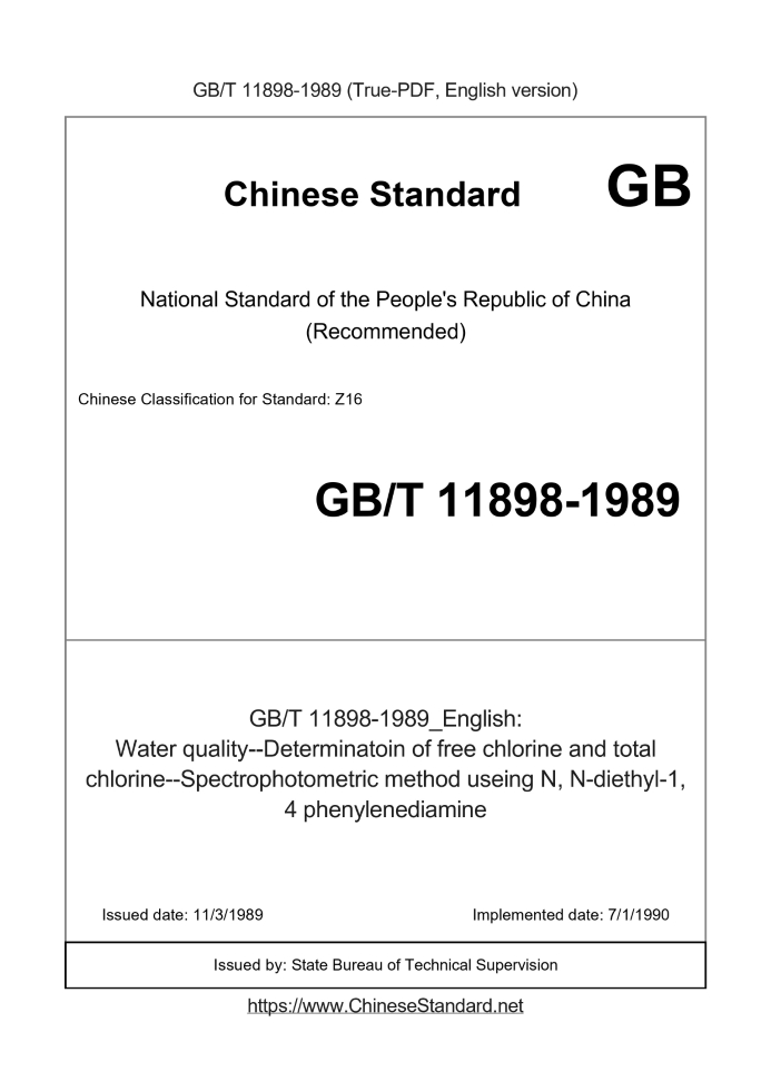 Delivery: <= 3 days. True-PDF full-copy in English will be manually translated and delivered via email. GB/T 11898-1989: Water quality--Determinatoin of free chlorine and total chlorine--Spectrophotometric method useing N, N-diethyl-1, 4 phenylenediamine Status: Obsolete