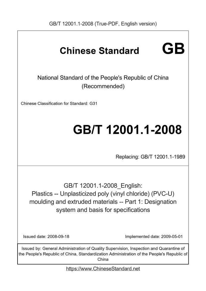 Delivery: <= 3 days. True-PDF full-copy in English will be manually translated and delivered via email. GB/T 12001.1-2008: Plastics -- Unplasticized poly (vinyl chloride) (PVC-U) moulding and extruded materials -- Part 1: Designation system and basis for specifications Status: Valid GB/T 12001.1: Historical versions