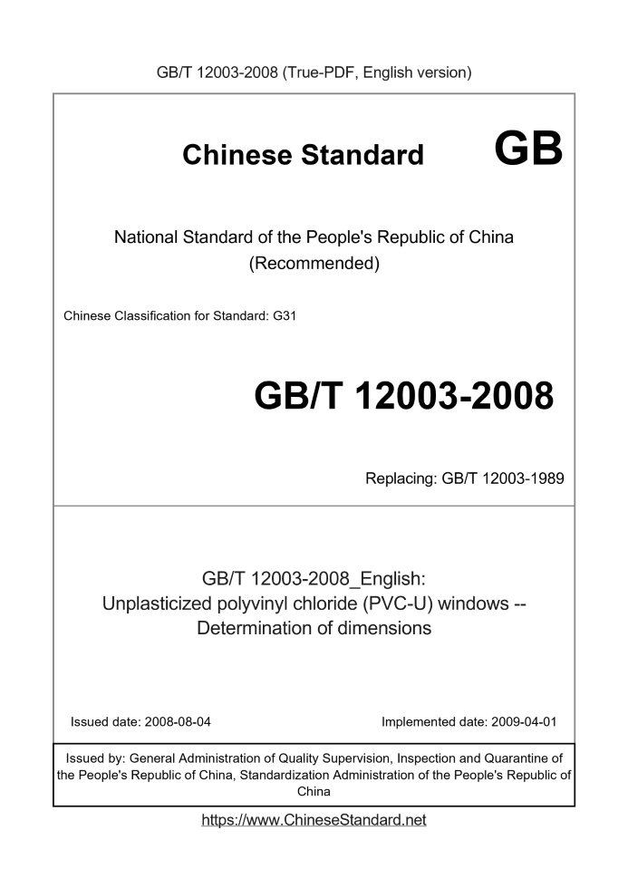 Delivery: <= 2 days. True-PDF full-copy in English will be manually translated and delivered via email. GB/T 12003-2008: Unplasticized polyvinyl chloride (PVC-U) windows -- Determination of dimensions Status: Valid GB/T 12003: Historical versions