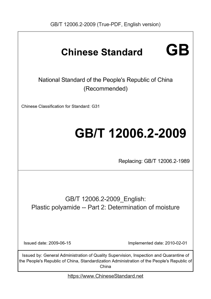 Plastic polyamide Part 2. Determination of moisture ICS 83.080 G31 National Standards of People's Republic of China Replacing GB/T 12006.2-1989 Polyamide plastic Part 2. Determination of moisture (ISO 15512.1999, Plastics-Determinationofwatercontent, MOD) Posted 2009-06-15 2010-02-01 implementation Administration of Quality Supervision, Inspection and Quarantine of People's Republic of China Standardization Administration of China released