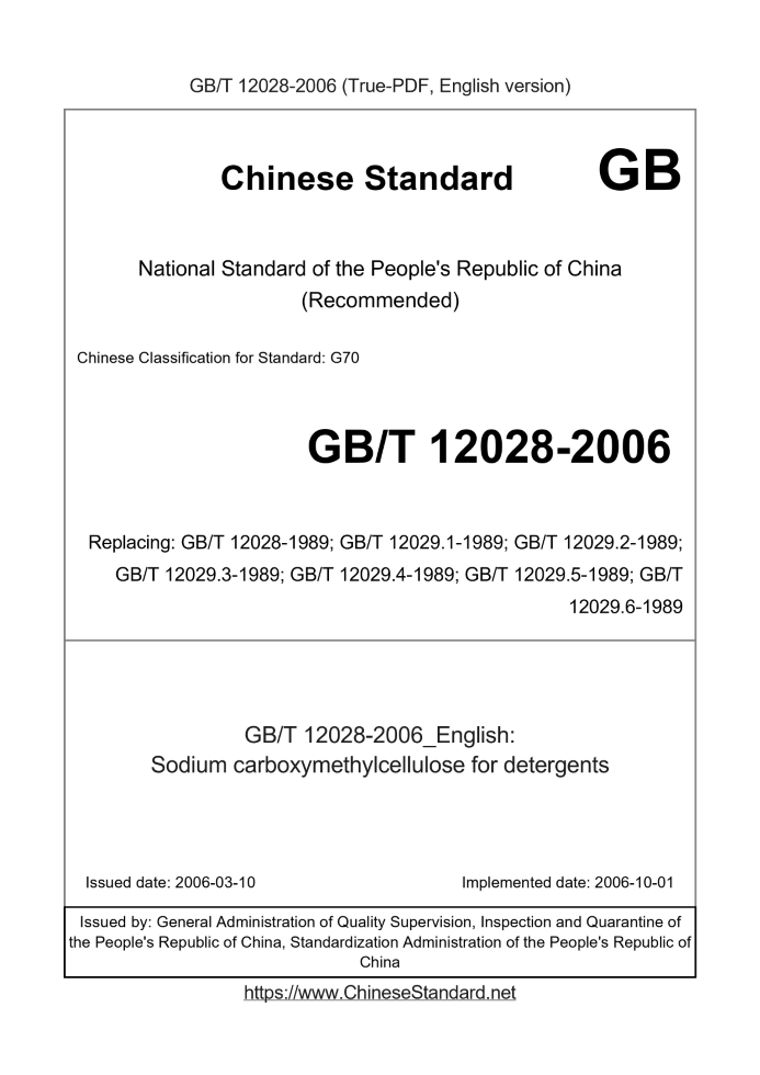 Delivery: <= 4 days. True-PDF full-copy in English will be manually translated and delivered via email. GB/T 12028-2006: Sodium carboxymethylcellulose for detergents Status: Valid GB/T 12028: Historical versions