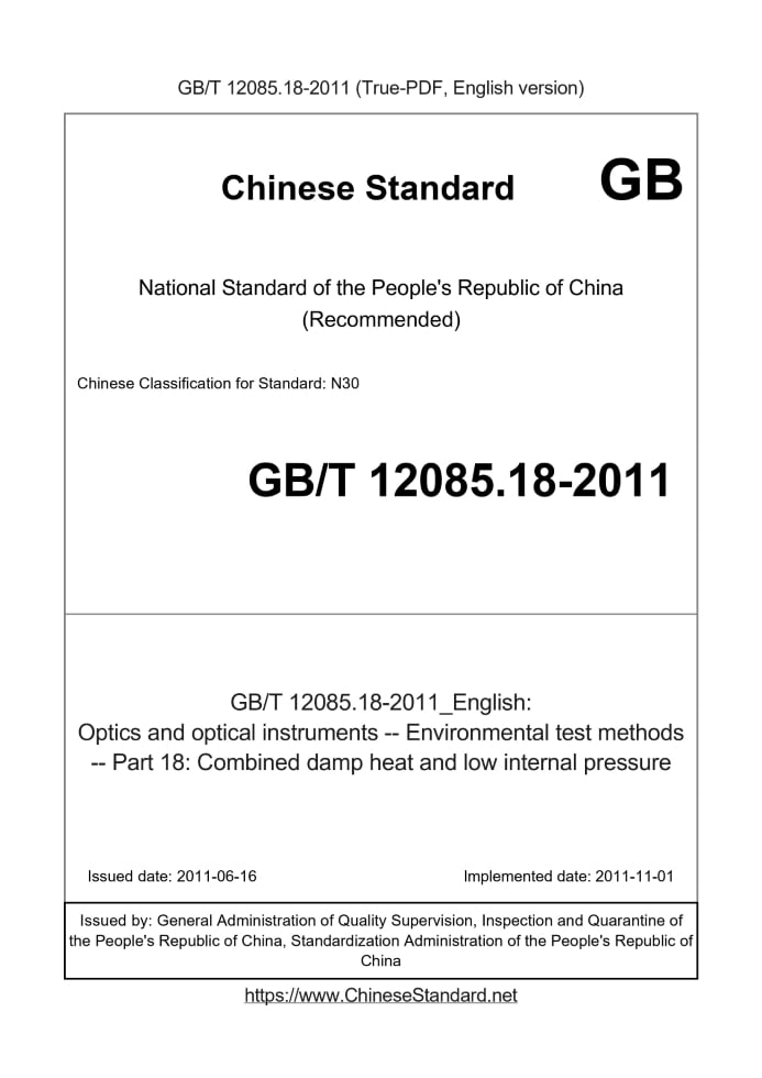Delivery: <= 3 days. True-PDF full-copy in English will be manually translated and delivered via email. GB/T 12085.18-2011: Optics and optical instruments -- Environmental test methods -- Part 18: Combined damp heat and low internal pressure Status: Obsolete