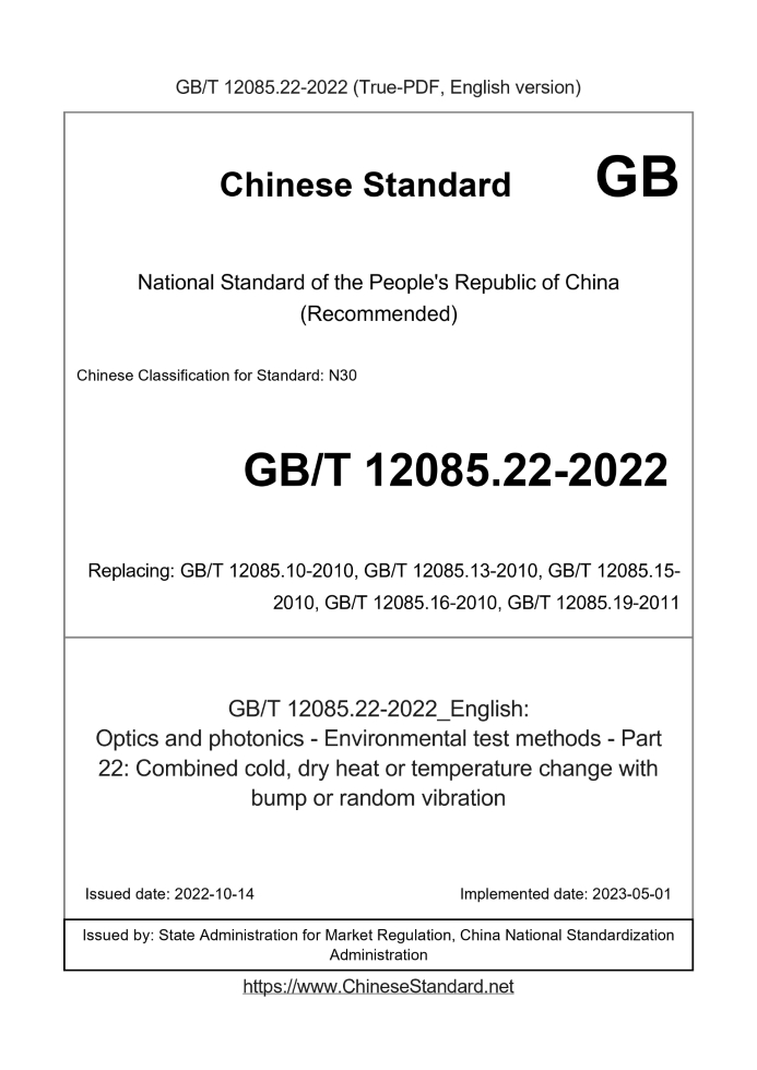Delivery: <= 3 days. True-PDF full-copy in English will be manually translated and delivered via email. GB/T 12085.22-2022: Optics and photonics - Environmental test methods - Part 22: Combined cold, dry heat or temperature change with bump or random vibration Status: Valid