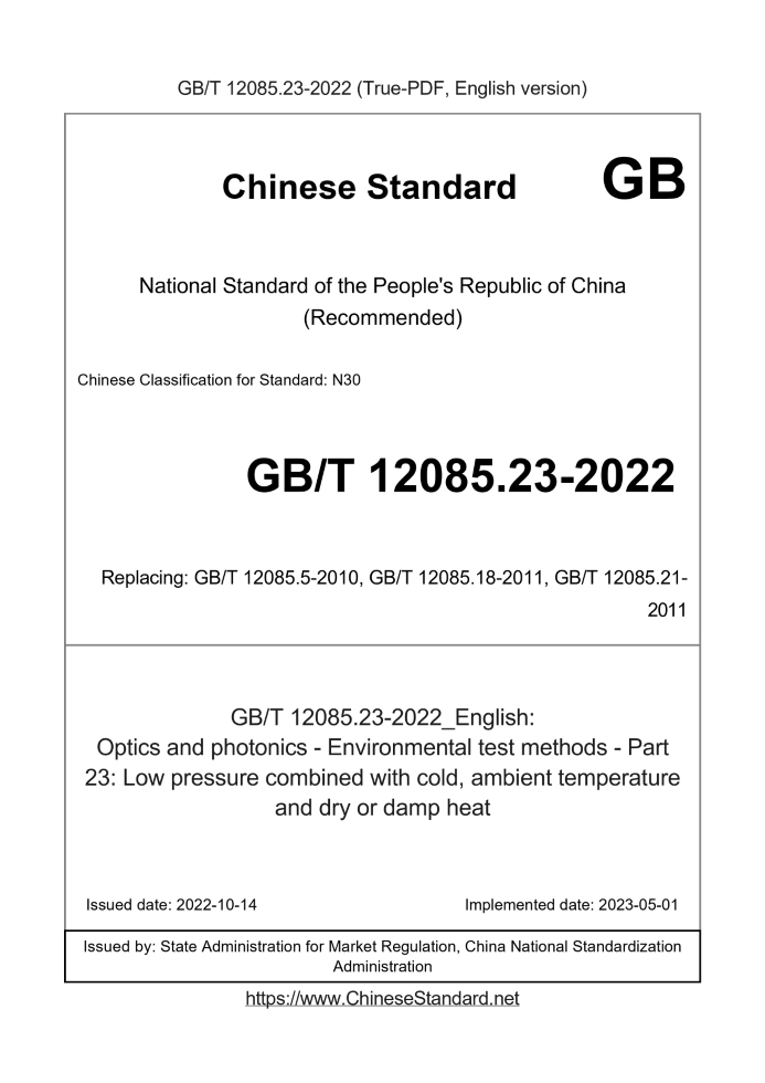 Delivery: <= 4 days. True-PDF full-copy in English will be manually translated and delivered via email. GB/T 12085.23-2022: Optics and photonics - Environmental test methods - Part 23: Low pressure combined with cold, ambient temperature and dry or damp heat Status: Valid