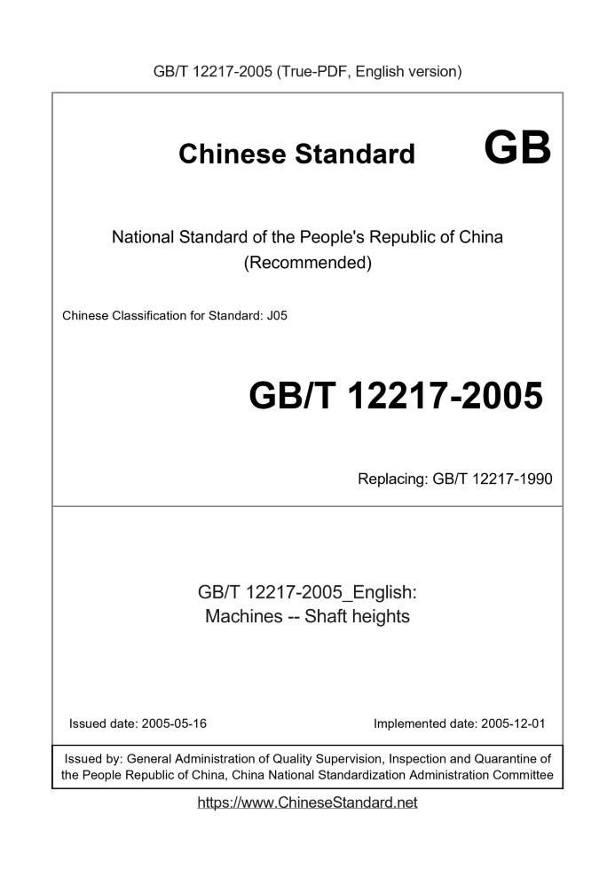 Delivery: <= 3 days. True-PDF full-copy in English will be manually translated and delivered via email. GB/T 12217-2005: Machines -- Shaft heights Status: Valid GB/T 12217: Historical versions