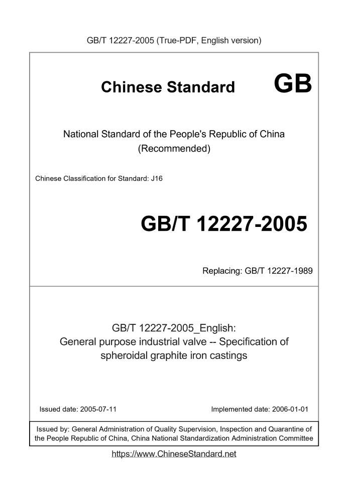 Delivery: <= 3 days. True-PDF full-copy in English will be manually translated and delivered via email. GB/T 12227-2005: General purpose industrial valve -- Specification of spheroidal graphite iron castings Status: Valid GB/T 12227: Historical versions