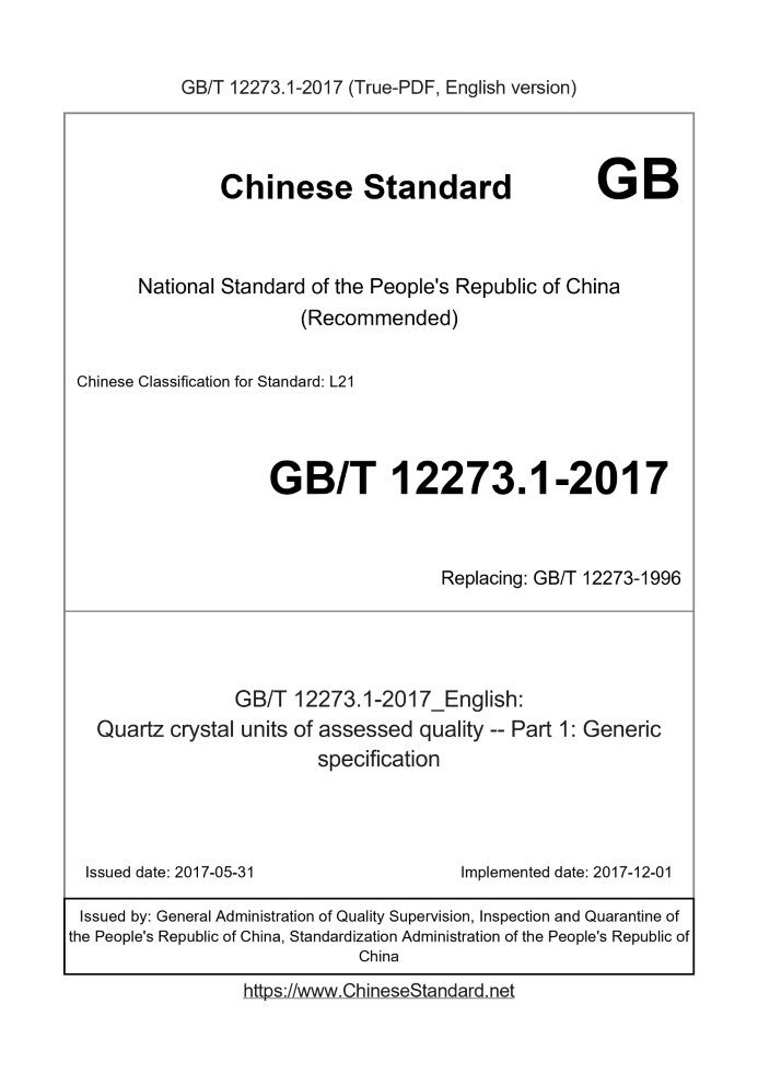 Delivery: <= 6 days. True-PDF full-copy in English will be manually translated and delivered via email. GB/T 12273.1-2017: Quartz crystal units of assessed quality -- Part 1: Generic specification Status: Valid GB/T 12273.1: Historical versions