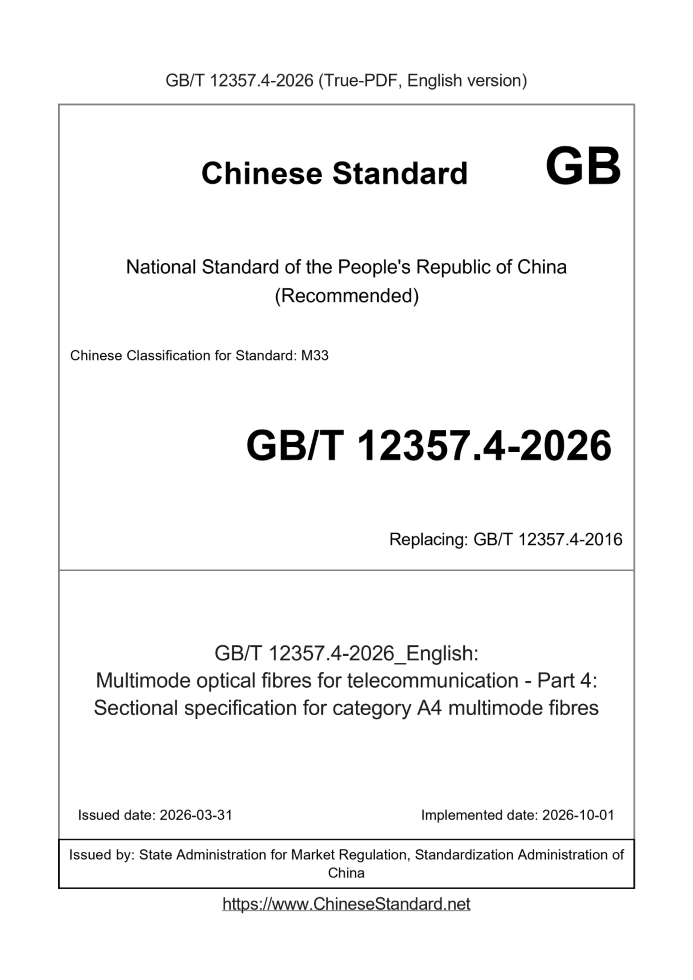 | GB/T 12357.4-2026 | English | RFQ | ASK | 3 days [Need to translate] | Multimode optical fibres for telecommunication - Part 4: Sectional specification for category A4 multimode fibres |