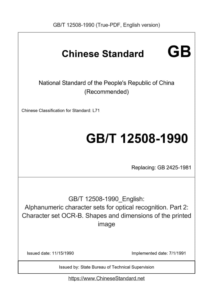 Delivery: <= 6 days. True-PDF full-copy in English will be manually translated and delivered via email. GB/T 12508-1990: Alphanumeric character sets for optical recognition. Part 2: Character set OCR-B. Shapes and dimensions of the printed image