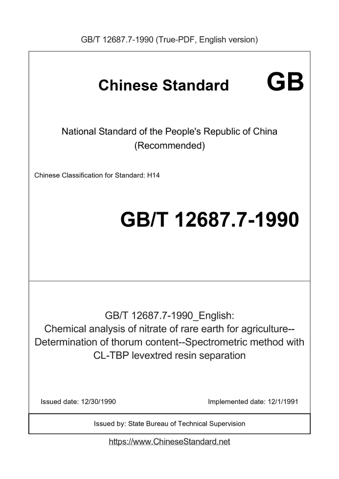 Delivery: <= 2 days. True-PDF full-copy in English will be manually translated and delivered via email. GB/T 12687.7-1990: Chemical analysis of nitrate of rare earth for agriculture--Determination of thorum content--Spectrometric method with CL-TBP levextred resin separation Status: Obsolete
