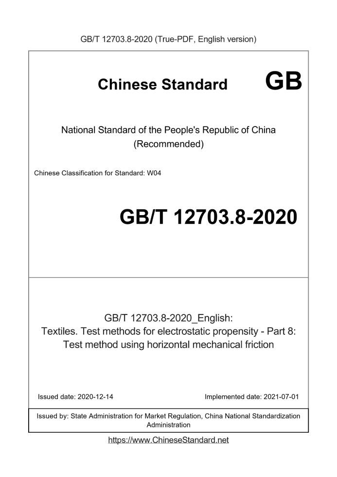 Delivery: <= 3 days. True-PDF full-copy in English will be manually translated and delivered via email. GB/T 12703.8-2020: Textiles. Test methods for electrostatic propensity - Part 8: Test method using horizontal mechanical friction Status: Valid