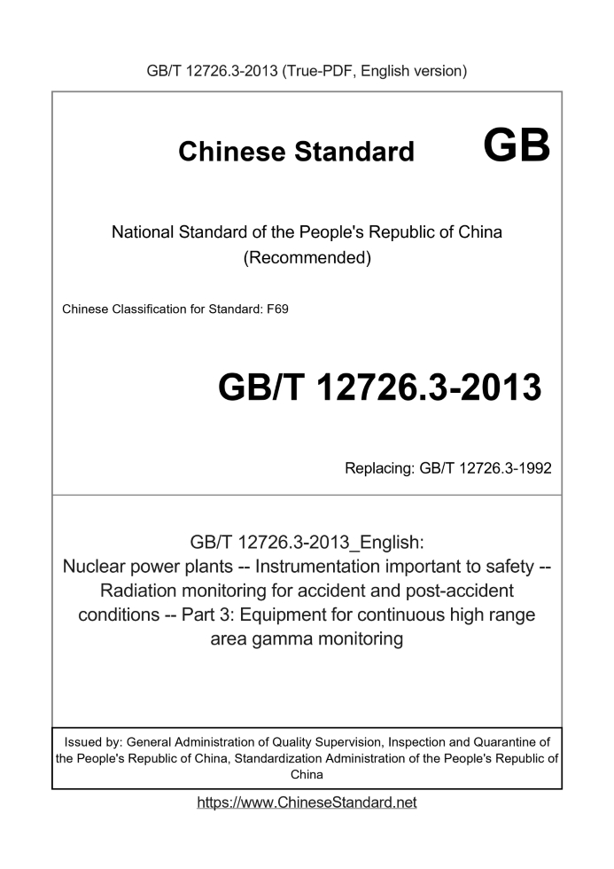 Basic dataStandard ID: GB/T 12726.3-2013 (GB/T12726.3-2013)Description (Translated English): Nuclear power plants -- Instrumentation important to safety -- Radiation monitoring for accident and post-accident conditions -- Part 3: Equipment for continuous high range area gamma monitoring Sector / Industry: National Standard (Recommended) Classification of Chinese Standard: F69 Classification of International Standard: 27.120.20 Word Count Estimation: 11,128 Older Standard (superseded by this standard): GB/T 12726.3-1992 Quoted Standard: GB/T 12726.1-2013; GB/T 14054-2013; ISO 4037-1; ISO 4037-2; ISO 4037-3; ISO 4037-4; ISO 6980.1; ISO 6980.2; ISO 6980.3; ISO 8529-1; ISO 8529 -2; ISO 8529-3; IEC 60780; IEC 61226 Adopted Standard: IEC 60951-3-2009, IDT Regulation (derived from): National Standards Bulletin No. 25 of 2013 Issuing agency(ies): General Administration of Quality Supervision, Inspection and Quarantine of the People's Republic of China, Standardization Administration of the People's Republic of China Summary: This standard specifies the design principles and performance criteria after the nuclear power plant accident and the high range area �� continuous monitoring equipment. GB/T 12726. 1-2O13 gives the general requirements for the technical characteristics of GB/T 12726.3-2013: Nuclear power plants -- Instrumentation important to safety -- Radiation monitoring for accident and post-accident conditions -- Part 3: Equipment for continuous high range area gamma monitoring---This is a DRAFT version for illustration, not a final translation. Full copy of true-PDF in English version (including equations, symbols, images, flow-chart, tables, and figures etc.) will be manually/carefully translated upon your order. . Nuclear power plants Instrunmentation important to safety Radiation monitoring for accident and post-accident conditions Part 3. Equipment for continous high range area gamma monitoring ICS 27.120.20 F69 National Standards of People's Republic of China Replacing GB/T 12726.3-1992 Nuclear power plant safety important instrument After the accident and radiation monitoring Part 3. High range area γ continuous monitoring equipment Part 3. Equipmentforcontinoushighrangeareagammamonitoring (IEC 60951-3.2009, IDT) Issued on. 2014-08-01 2013-12-17 implementation Administration of Quality Supervision, Inspection and Quarantine of People's Republic of China Standardization Administration of China released Table of ContentsPreface Ⅰ Introduction Ⅱ 1 Scope 1 2 Normative references 1 3 Terms and definitions 4 Design Principle 2 4.1 Overview 2 4.2 Measuring range 2 4.3 Accuracy (relative error) 2 Position detector 2 4.4 4.5 Radiation Detector response 2 4.6 accident conditions relevant requirements 2 5 Functional Test 2 5.1 General Requirements 2 5.2 Reference Source 3 5.3 Performance Characteristics 3 1 4 energy response Table 1 SAC/TC30/SC2/SC3 standard series Ⅳ Supplementary Table 2 GB/T 12726.1-2013 test specified Additional Tests 5ForewordGB/T 12726 "after the nuclear power plant safety is important instruments accident and radiation monitoring" is divided into four parts. --- Part 1. General requirements; --- Part 2. gaseous effluents and ventilation equipment for continuous monitoring of radioactivity in the offline; --- Part 3. High range area γ continuous monitoring equipment; --- Part 4. Process flow tube or inner tube beside continuous radioactivity monitoring equipment. This section GB/T Part of 312,726. This section drafted in accordance with GB/T 1.1-2009 given rules. This Part replaces GB/T 12726.3-1992 "after a nuclear power plant accident and the third part of the radiation monitoring equipment. High range area γ Continuous monitoring equipment, "compared with the GB/T 12726.3-1992 main technical changes are as follows. --- Standard name changed to "nuclear power plant safety important instrument for accident and post accident radiation monitoring - Part 3. High range area γ continuous Monitoring equipment "; --- "2 Normative references" to add some standard text in the standard reference; --- "3 Terms and definitions" direct terms and definitions GB/T 12726.1-2013 given; Title --- Chapter 4, "Design requirements" to "design principles", according to the contents of IEC 60951-3.2009 modification; Title --- Chapter 5, "Technical characteristics and test methods" to "functional test", according to the contents of IEC 60951-3.2009 modification. This section uses the translation method is equivalent to using IEC 60951-3. Radiation monitoring after 2009 "Instrumentation important to safety of nuclear power plants for accident and Part 3. High range area γ continuous monitoring equipment. " Consistency correspondence between this part of international documents and normative references of our files are as follows. --- GB/T 12162 (all parts) for calibrating dosemeters and dose rate meters and for determining their response to X and γ reference radiations [ISO 4037 (all parts)]; --- GB/T 12164 (all parts) β reference radiation [ISO 6980 (all parts)]; --- GB/T 12727-2002 nuclear power plant safety systems of electrical equipment qualification (IEC 60780.1998, MOD); --- GB/T 14055 (all parts) Reference neutron radiation [ISO 8529 (all parts)]; --- GB/T 15474-2010 nuclear power plant instrumentation and control functions important to safety classification (IEC 61226.2005, MOD); For ease of use, this section made the following editorial changes. --- Delete the original preface to the international standards; --- Will be in "2 Normative references" have been corresponding national standards with international standards to our standards, increase in the "range 1" Appearing in GB/T 14054-2013; --- 5.1 in "these tests are shown in Table 1" to "see GB test under standard test conditions of/T 12726.1-2013 in Table 2, the test with the impact of the amount of changes, see GB/T 12726.1-2013 in Table 3. See Additional tests conducted Table 2. "; --- 5.3.1 in the "sensitivity