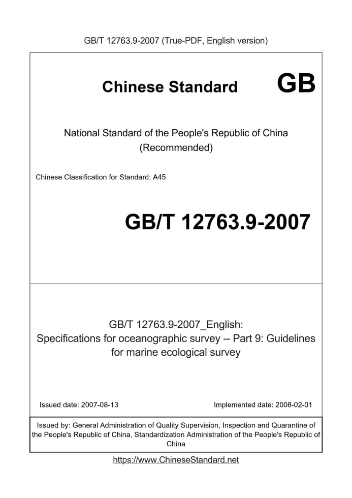 Delivery: <= 5 days. True-PDF full-copy in English will be manually translated and delivered via email. GB/T 12763.9-2007: Specifications for oceanographic survey -- Part 9: Guidelines for marine ecological survey Status: Valid