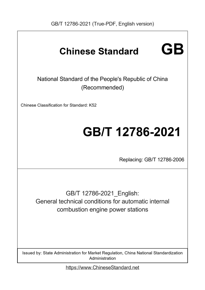 Delivery: <= 5 days. True-PDF full-copy in English will be manually translated and delivered via email. GB/T 12786-2021: General technical conditions for automatic internal combustion engine power stations Status: Valid GB/T 12786: Historical versions