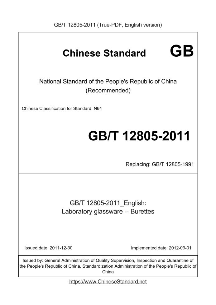 Delivery: <= 3 days. True-PDF full-copy in English will be manually translated and delivered via email. GB/T 12805-2011: Laboratory glassware -- Burettes Status: Valid GB/T 12805: Historical versions