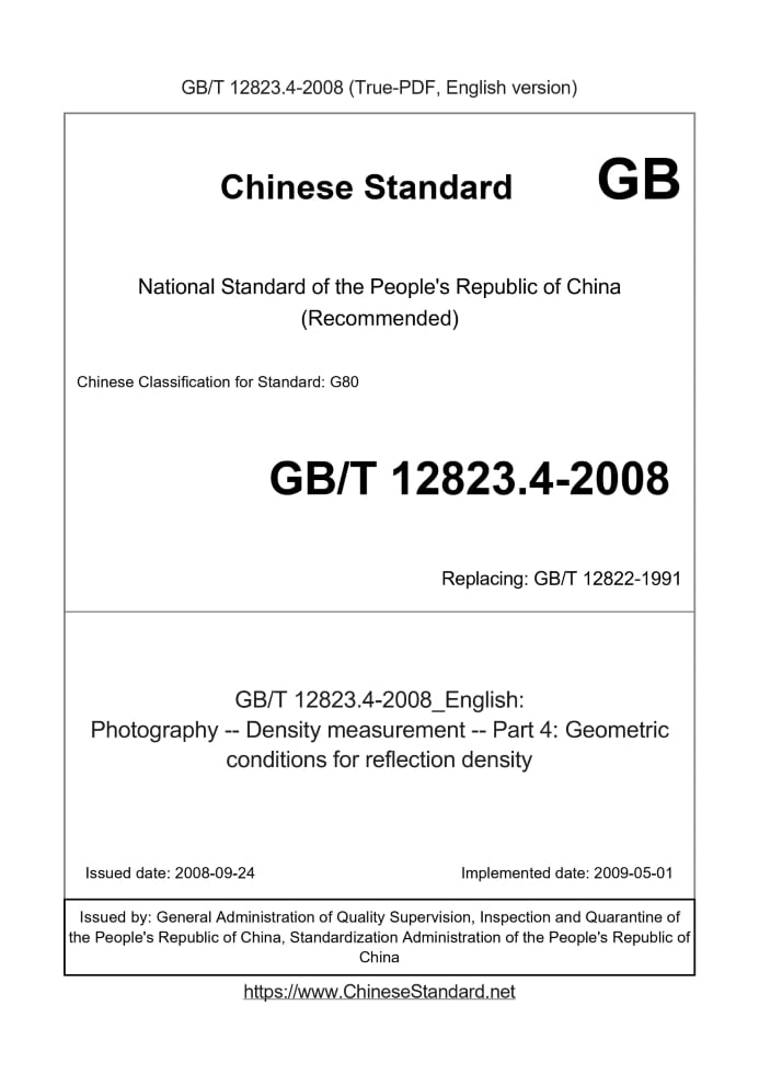 Delivery: <= 3 days. True-PDF full-copy in English will be manually translated and delivered via email. GB/T 12823.4-2008: Photography -- Density measurement -- Part 4: Geometric conditions for reflection density Status: Valid