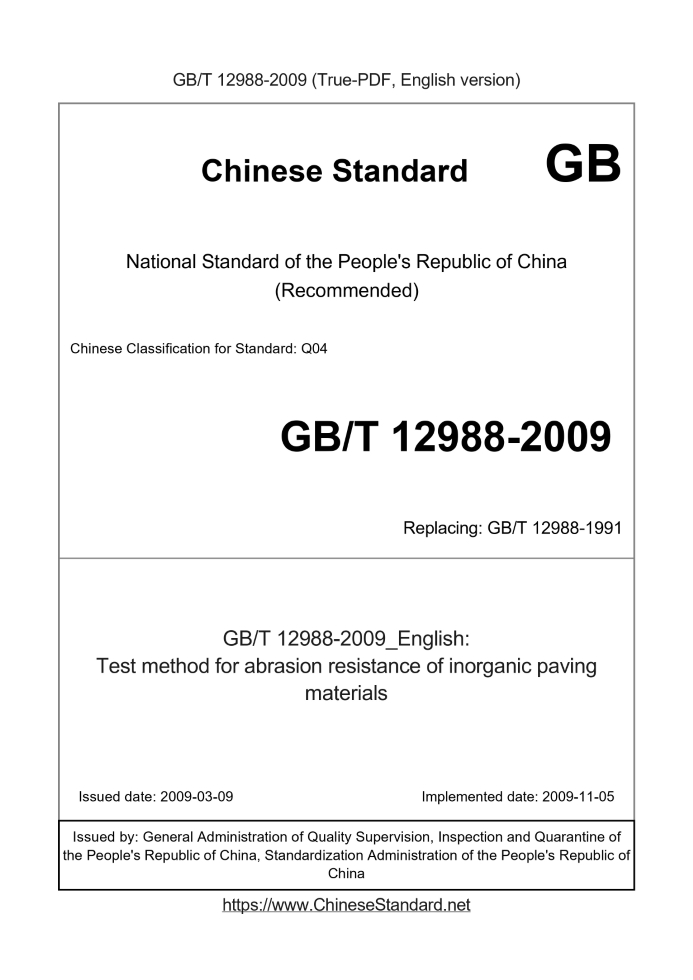 Delivery: <= 3 days. True-PDF full-copy in English will be manually translated and delivered via email. GB/T 12988-2009: Test method for abrasion resistance of inorganic paving materials Status: Valid GB/T 12988: Historical versions