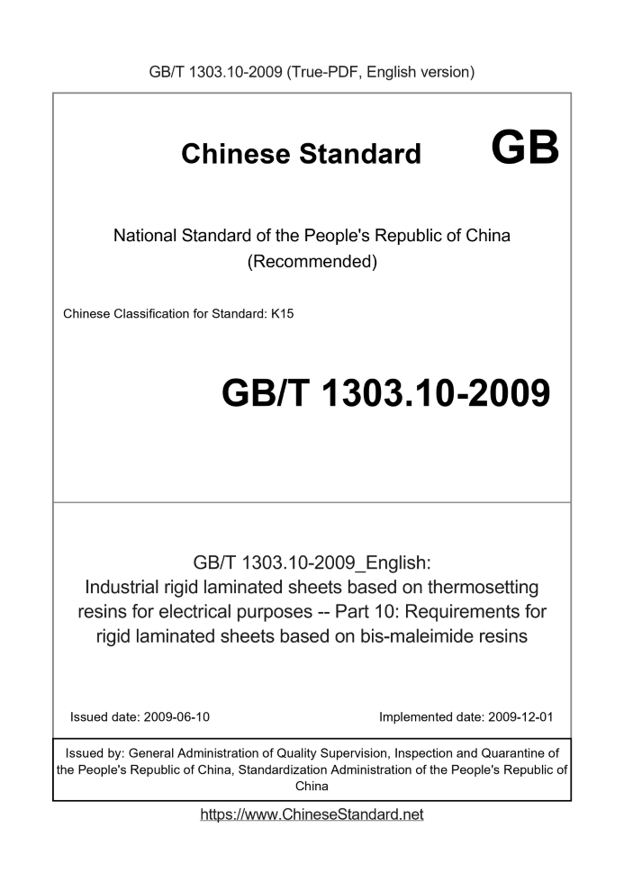 Basic dataStandard ID: GB/T 1303.10-2009 (GB/T1303.10-2009)Description (Translated English): Industrial rigid laminated sheets based on thermosetting resins for electrical purposes -- Part 10: Requirements for rigid laminated sheets based on bis-maleimide resins Sector / Industry: National Standard (Recommended) Classification of Chinese Standard: K15 Classification of International Standard: 29.035.01 Word Count Estimation: 12,180 Date of Issue: 2009-06-10 Date of Implementation: 2009-12-01 Quoted Standard: GB/T 1303.1-2009; GB/T 1303.2-2009; GB/T 1303.3-2008 Adopted Standard: IEC 60893-3-7-2003, MOD Regulation (derived from): Announcement of Newly Approved National Standards No. 8, 2009 (No. 148 overall) Issuing agency(ies): General Administration of Quality Supervision, Inspection and Quarantine of the People's Republic of China, Standardization Administration of the People's Republic of China Summary: This standard specifies the bismaleimide resin laminate rigid classification, nomenclature, requirements, test methods, and delivery requirements. This section applies to the glass cloth substrate to a bismaleimide resin is bonded pairs formed by hot pressing maleimide rigid plastic resin laminate. GB/T 1303.10-2009: Industrial rigid laminated sheets based on thermosetting resins for electrical purposes -- Part 10: Requirements for rigid laminated sheets based on bis-maleimide resins---This is a DRAFT version for illustration, not a final translation. Full copy of true-PDF in English version (including equations, symbols, images, flow-chart, tables, and figures etc.) will be manually/carefully translated upon your order. Industrial rigid laminated sheets based on thermosetting resins for electrical purposes Part 10. Requirements for rigid laminated sheets based on bis-maleimide resins ICS 29.035.01 K15 National Standards of People's Republic of China Thermosetting resins for electrical industrial rigid laminated sheets Part 10. bismaleimide rigid laminated sheets (IEC 60893-3-7.2003, Insulatingmaterials-Industrialrigidlaminated Part 3. Specificationsforindividualmaterials- Sheet7. Requirementsforrigidlaminatedsheets basedonpolyimideresins, MOD) Posted 2009-12-01 2009-06-10 implementation Administration of Quality Supervision, Inspection and Quarantine of People's Republic of China Standardization Administration of China released ForewordGB/T 1303 "thermosetting resins for electrical industrial rigid laminated board", is divided into the following sections. --- Part 1. Definitions, designations and general requirements; --- Part 2. Test methods; --- Part 3. Industrial rigid laminated board model; --- Part 4. rigid epoxy laminates; --- Part 5. rigid melamine resin laminate; --- Part 6. rigid phenolic resin laminate; --- Part 7. Polyester resin rigid laminates; --- Part 8. rigid silicone resin laminate; --- Part 9. rigid polyimide resin laminate; --- Part 10. bismaleimide rigid laminates; --- Part 11. Polyamide-imide resin rigid laminates; This section GB/T 1303 Part 10. The partial modification of the use of IEC 60893-3-7.2003 "thermosetting resins for electrical industrial rigid laminated sheets - Part 3. Specifications for individual materials Regulation Fan Section 7. polyimide resin laminate rigid requirements "(in English) of the relevant content. This part of IEC 60893-3-7.2003 differences are as follows. a) Remove the IEC 60893-3-7.2003 preface and introduction, the introduction content into this part of the preamble; b) of Chapter 1, "program" has been modified, deleted the material meets note, increasing the scope of application; c) delete the dimension in Chapter 3 of labeling information; d) according to the actual situation needs, supplemented with "apparent flexural modulus of elasticity," "vertical layer to the compression strength", "parallel to the shear layer Strength "," Tensile Strength "," adhesive strength "," 1MHz lower dielectric loss factor "," 1MHz dielectric constant "," resistance to tracking Index "," Temperature Index "and" density "of performance requirements related to technical differences in the terms they are involved in the margin A single vertical line identification; e) The "Requirements" chapter of the press, "look", "size" and "flatness", "performance requirements," points written in the "supply requirements" as a separate chapter Write, while IEC 60893-3-7.2003 in Table 5 were modified, the contents of the memo included in this section of Table 6. Table Note; the IEC 60893-3-7.2003 Table 5 - Test methods included in this section reg Chapter 5, "test" rewrite and adds Test methods and cut slats General; f) Remove the IEC 60893-3-7.2003's "References." This part is proposed by the China Electrical Equipment Industrial Association. This part of the National Standardization Technical Committee of the insulating material (SAC/TC51) centralized. This section is drafted. Xian Xi, electrical materials Co., Ltd., Beijing Fu Runda new insulation material limited liability company, Guilin electricity Institute is science. Drafters of this section. Duchao Yun, Liu Qihuan, Luozhuan Yong. This section first formulated. Thermosetting resins for electrical industrial rigid laminated sheets Part 10. bismaleimide rigid laminated sheets1 ScopeGB/T 1303 provisions of this part of the classification bismaleimide rigid laminate, name, requirements, test methods and Availability Claim. This section applies to glass cloth as a base material for bismaleimide an adhesive resin formed by hot pressing hard bismaleimide resin Laminate.2 Normative referencesThe following documents contain provisions which, through GB/T reference in this 1303 constitute provisions of this section. For dated reference documents Member, all subsequent amendments (not including errata content) or revisions do not apply to this section, however, encouraged to reach under this section Parties to research agreement to use the latest versions of these documents. For undated reference documents, the late