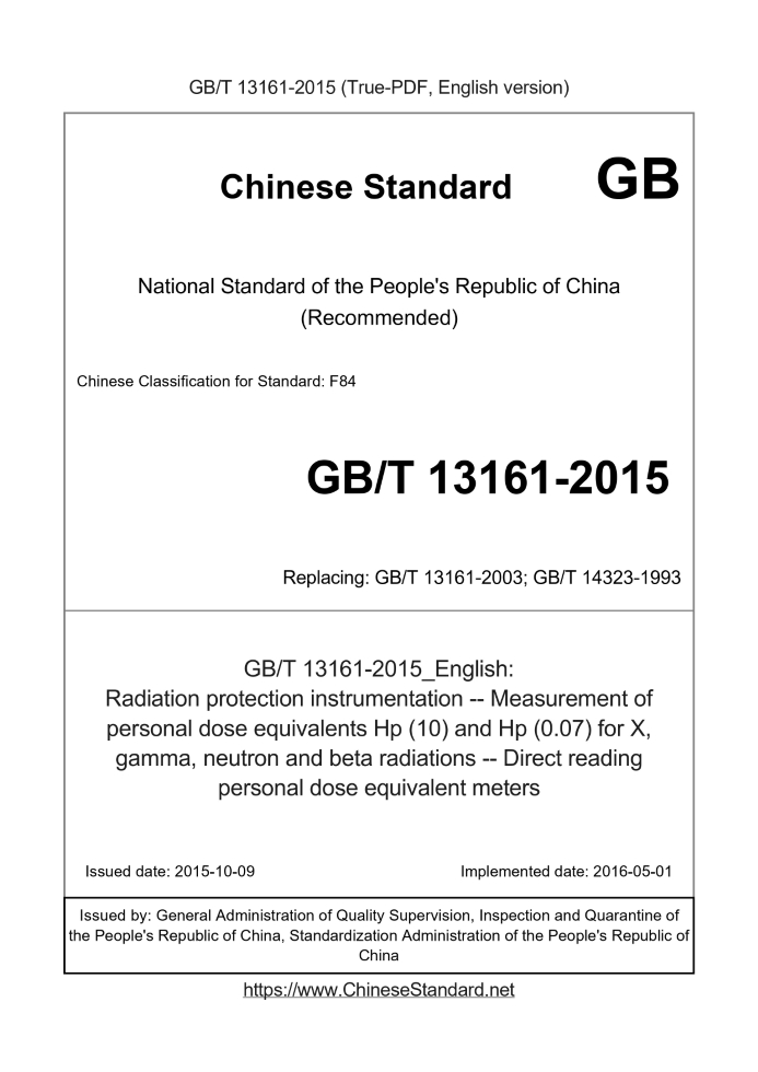 Delivery: <= 6 days. True-PDF full-copy in English will be manually translated and delivered via email. GB/T 13161-2015: Radiation protection instrumentation -- Measurement of personal dose equivalents Hp (10) and Hp (0.07) for X, gamma, neutron and beta radiations -- Direct reading personal dose equivalent meters Status: Valid GB/T 13161: Historical versions