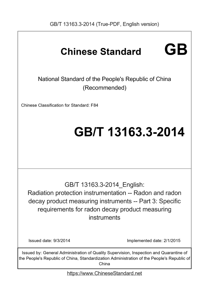 Delivery: <= 3 days. True-PDF full-copy in English will be manually translated and delivered via email. GB/T 13163.3-2014: Radiation protection instrumentation -- Radon and radon decay product measuring instruments -- Part 3: Specific requirements for radon decay product measuring instruments Status: Valid