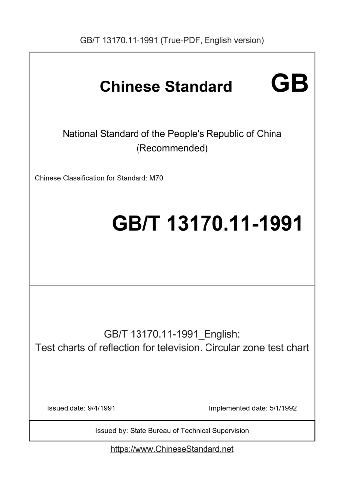 Delivery: <= 2 days. True-PDF full-copy in English will be manually translated and delivered via email. GB/T 13170.11-1991: Test charts of reflection for television. Circular zone test chart Status: Obsolete